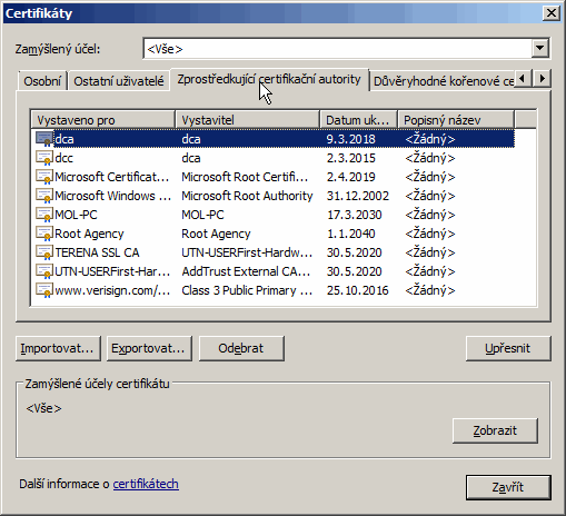 vyberte ho, dejte Exportovat, projděte průvodce, nechte výchozí hodnoty, jen vyberte jméno souboru pro export a certifikát uložte. Pak se přepněte na záložku Důvěryhodné kořenové certifikační autority, klikněte na Importovat a čerstvě exportovaný certifikát naimportujte.