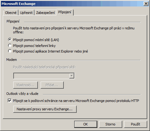 Na kartě Připojení zaškrtneme políčko pod textem Outlook vždy a všude a klikneme na tlačítko Nastavení proxy serveru Exchange….