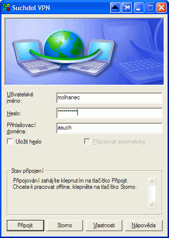 VPN připojení vytvořené tímto programem má ještě tu vlastnost, že při přihlášení do VPN automaticky připojí disky P a S. Při odhlášení je zase odpojí.